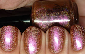 Aphrodite, from the Goddess Collection, is a scattered holo with a shimmery copper red with duochrome magenta-to-gold highlights. I wore this in three thin coats and it has a great formula. It is available for $12.50 for full size and $5 for mini size.